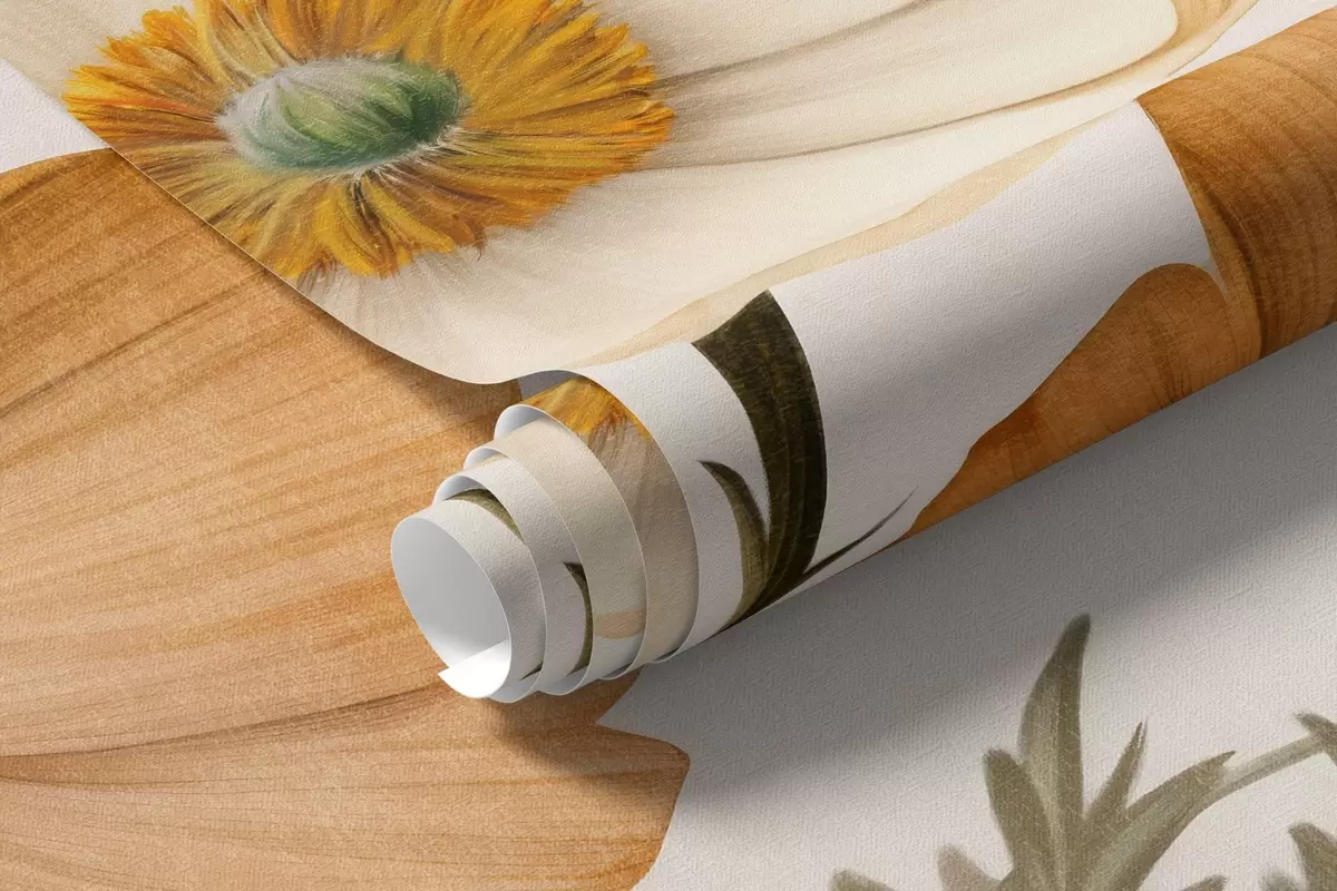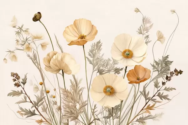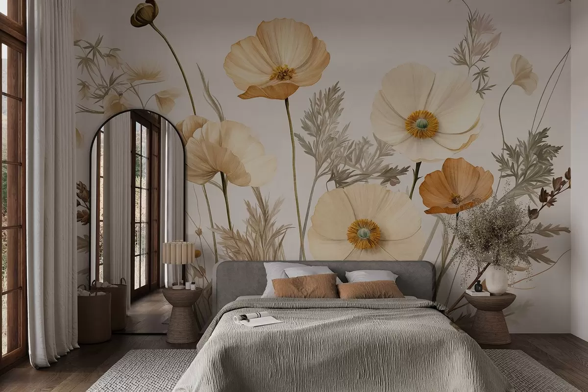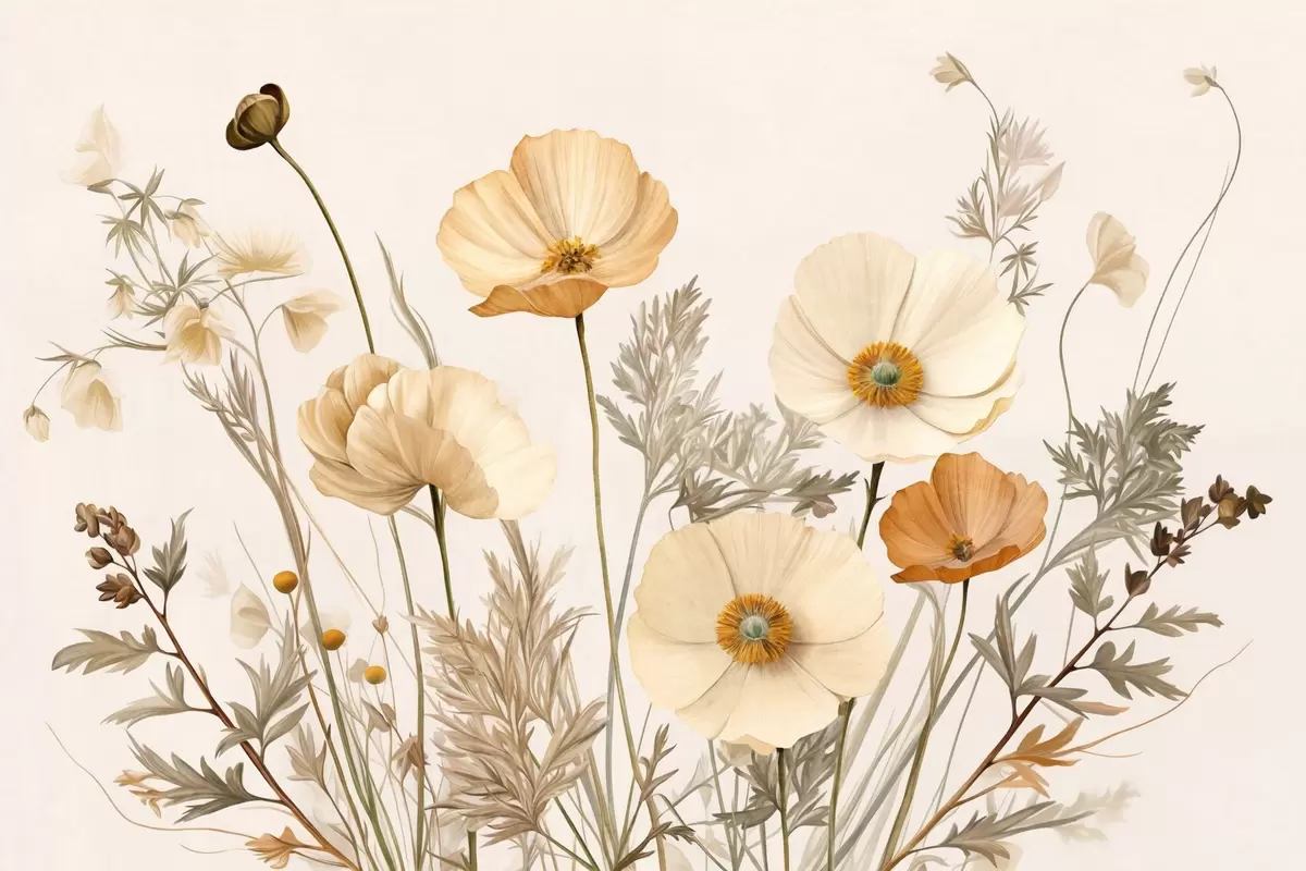 Orange and white vintage textured poppies with thin stems and leaves, light beige background, watercolor style - Wall mural (No. w09293)