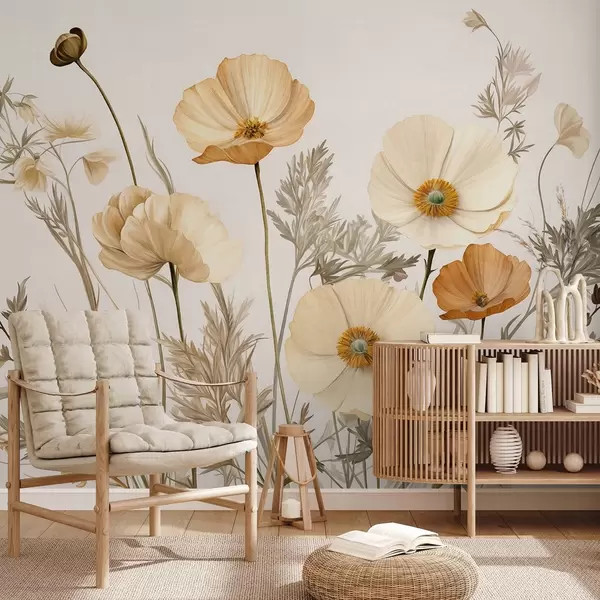 Orange and white vintage textured poppies with thin stems and leaves, light beige background, watercolor style - Wall mural (No. w09293)
