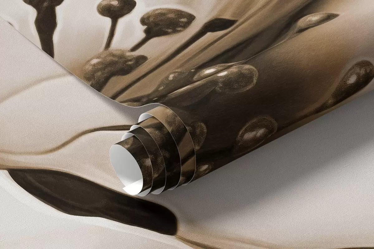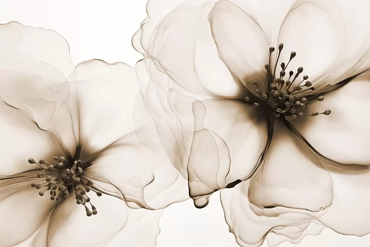 Two translucent textured brown flowers with visible stamens, overlapping delicate petals, and a soft flowing texture - Wall mural (No. w09295)