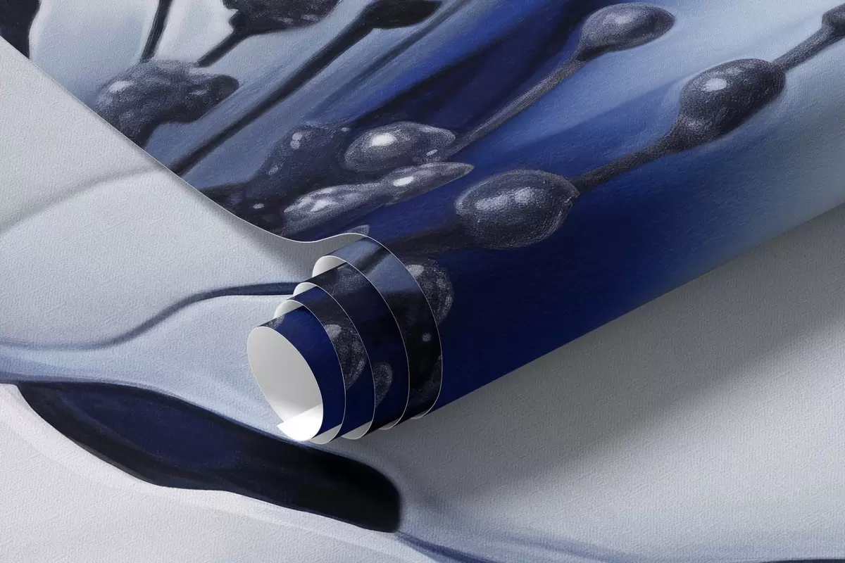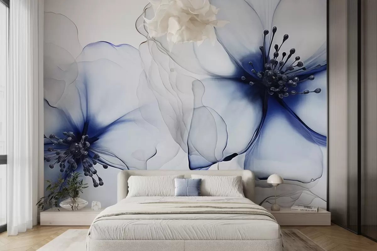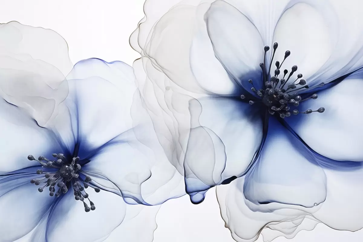 Two translucent textured blue flowers with visible stamens, overlapping delicate petals, and a soft flowing texture - Wall mural (No. w09295v1)