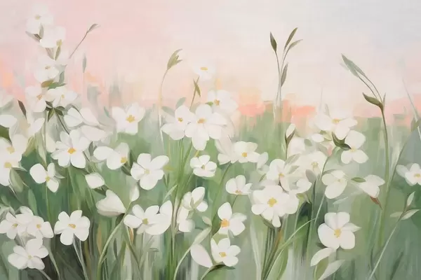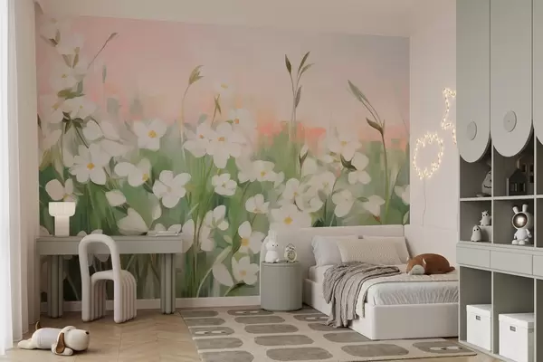 Abstract field of wildflowers with green stems and leaves, against a soft pink and white textured sky - Wall mural (No. w09297)