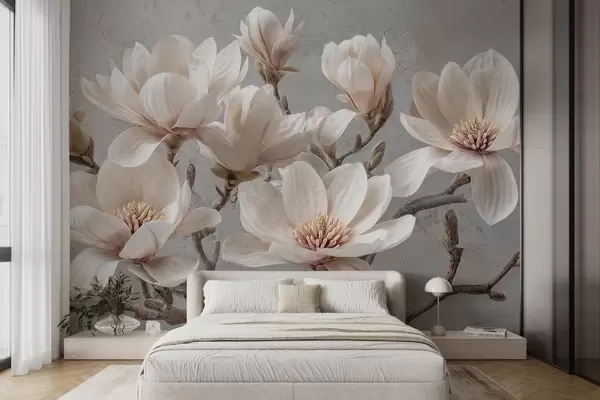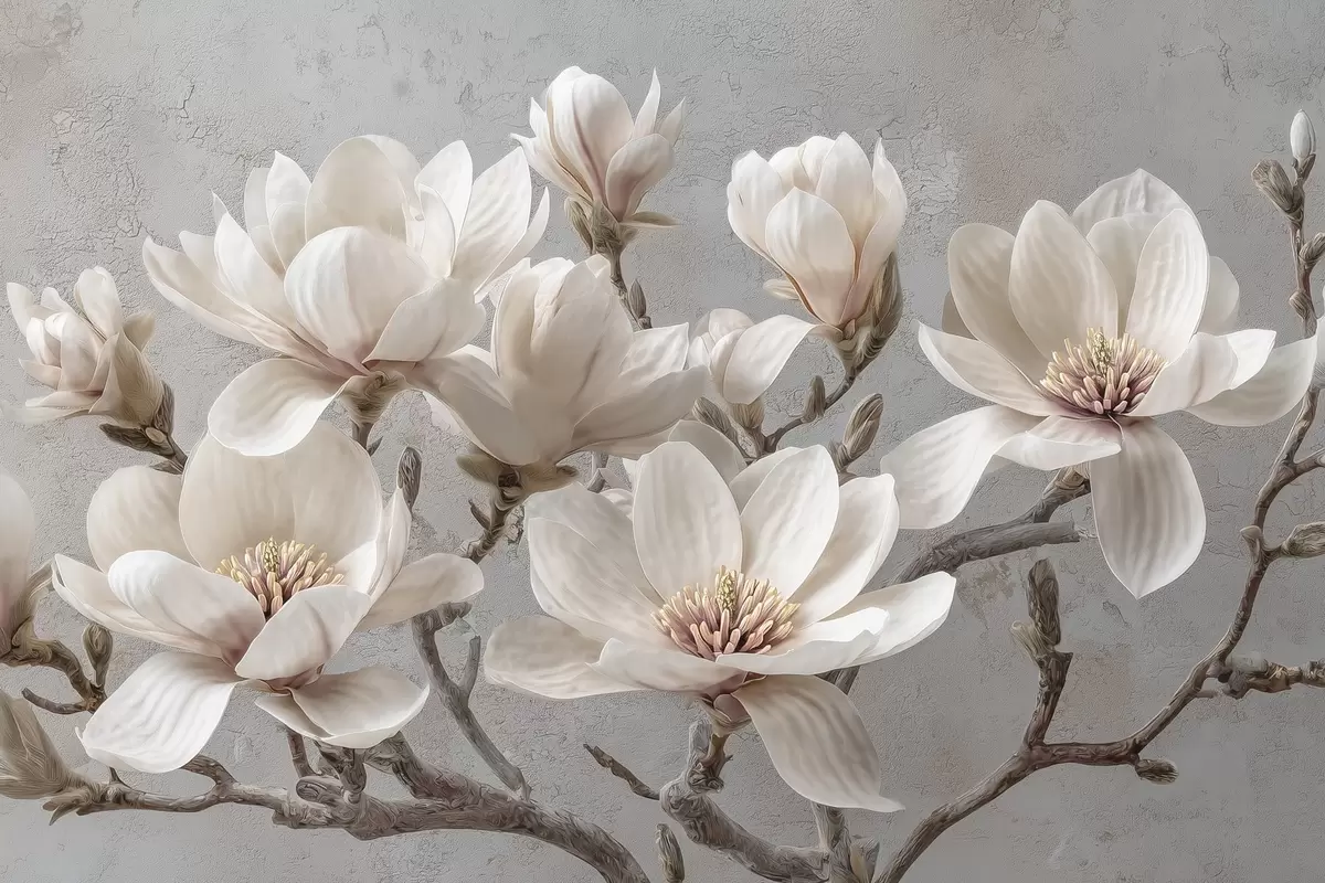 Magnolia branches with large light flowers in muted tones - Wall mural (No. w09305)