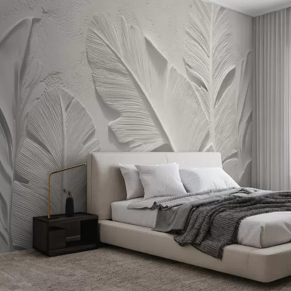 Textured grey leaves on a background with faux plaster relief - Wall mural (No. w09307)