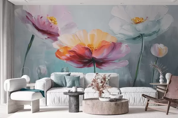wall murals Bright flowers in oil painting technique on a blue background w09310