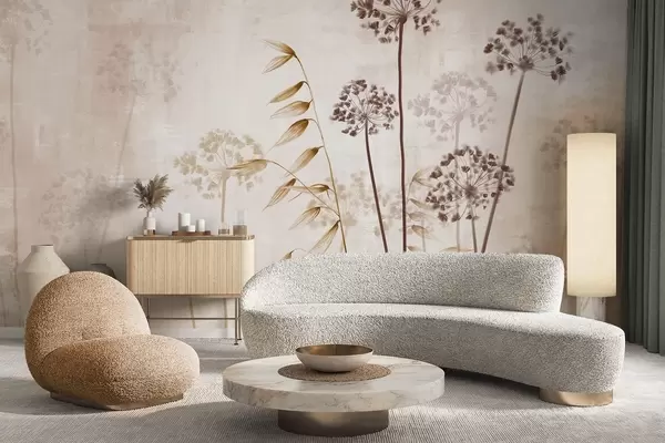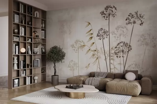 Dried flowers drawing with long stems, monochrome palette, against a textured, light beige background, botanical illustration - Wall mural (No. w09314v1)