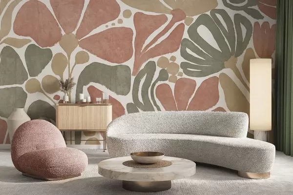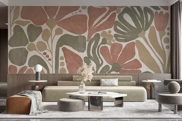 Abstract flowers in shades of red, green , and beige, with a light background, in a flat , stylized modern minimalist design - Wall mural (No. w09315)