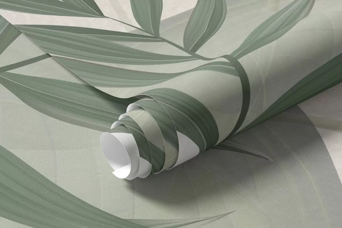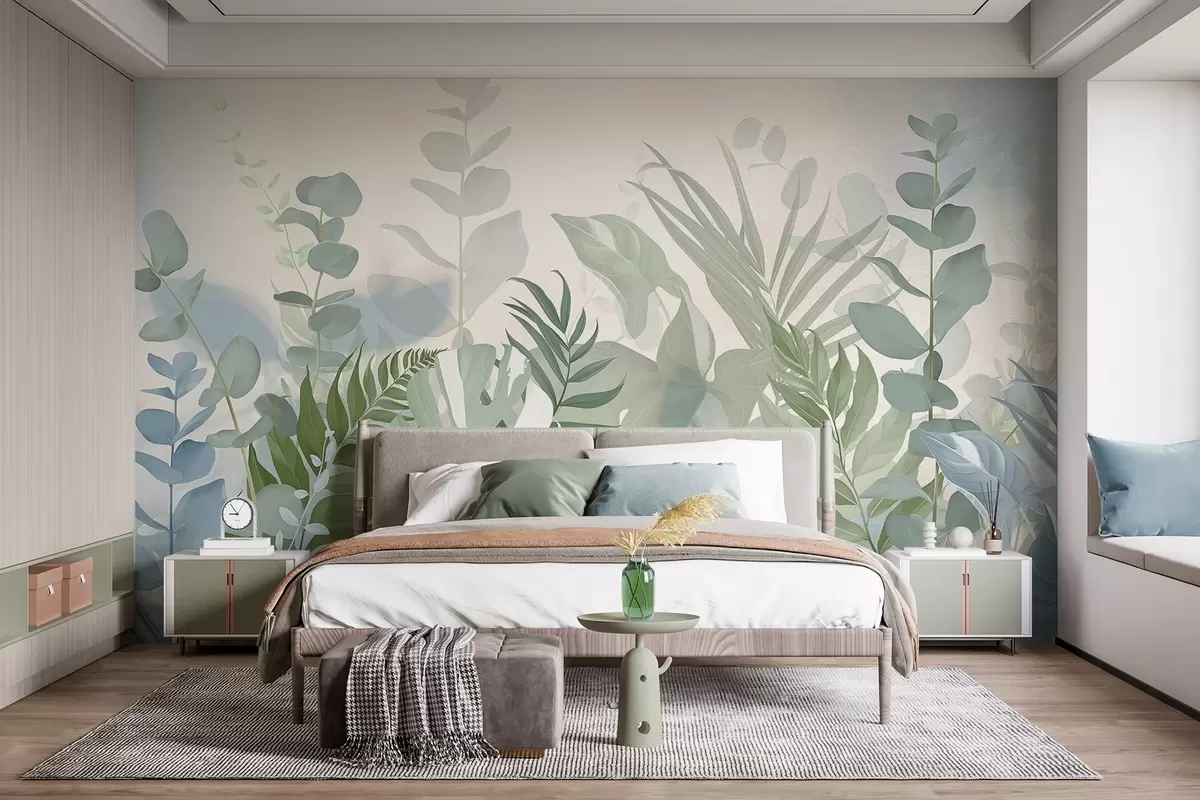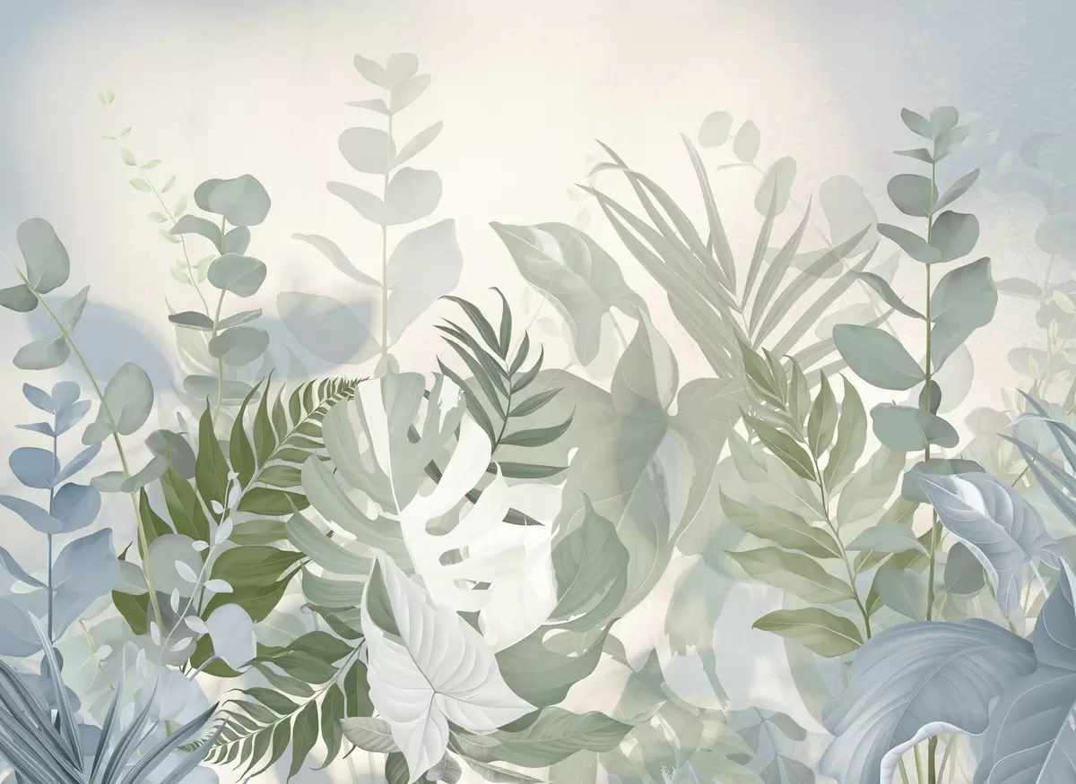 Pastel green plants ferns, monstera and eucalyptus, light textured background, soft lighting, peaceful , botanical illustration - Wall mural (No. w09316)