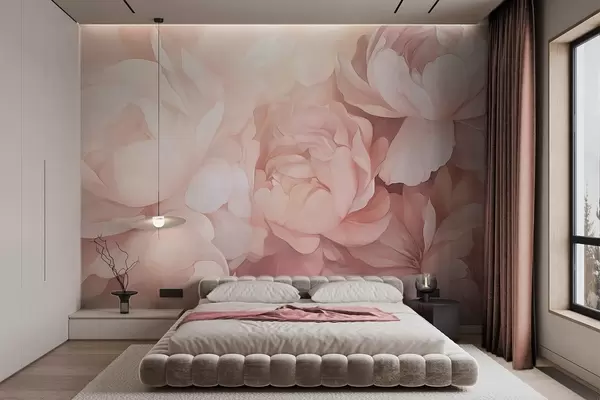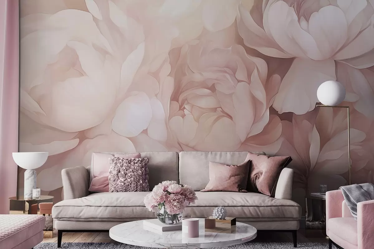 Light pastel pink peonies with soft, textured delicate petals, arranged closely together, creating a dense floral art, soft lighting - Wall mural (No. w09319)