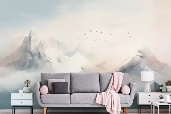 Snow-covered mountain peaks in morning mist with soaring birds - Wall mural (No. w09326)