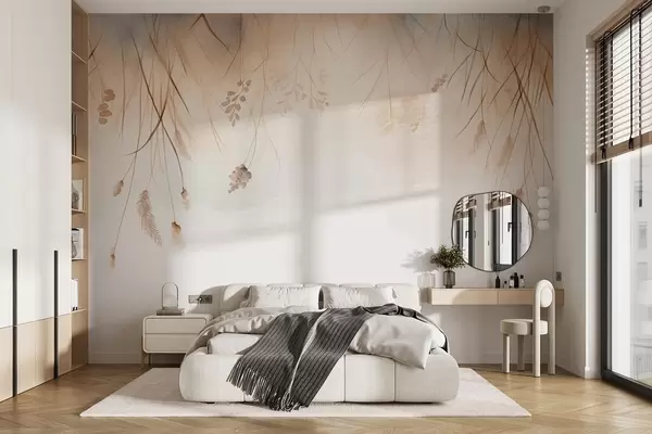 wall murals Drooping cattails and grain ears in mist in soft beige and brown shades w09328