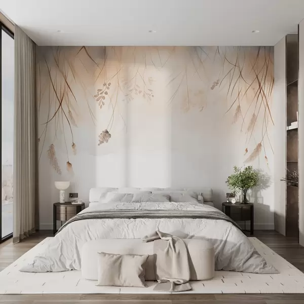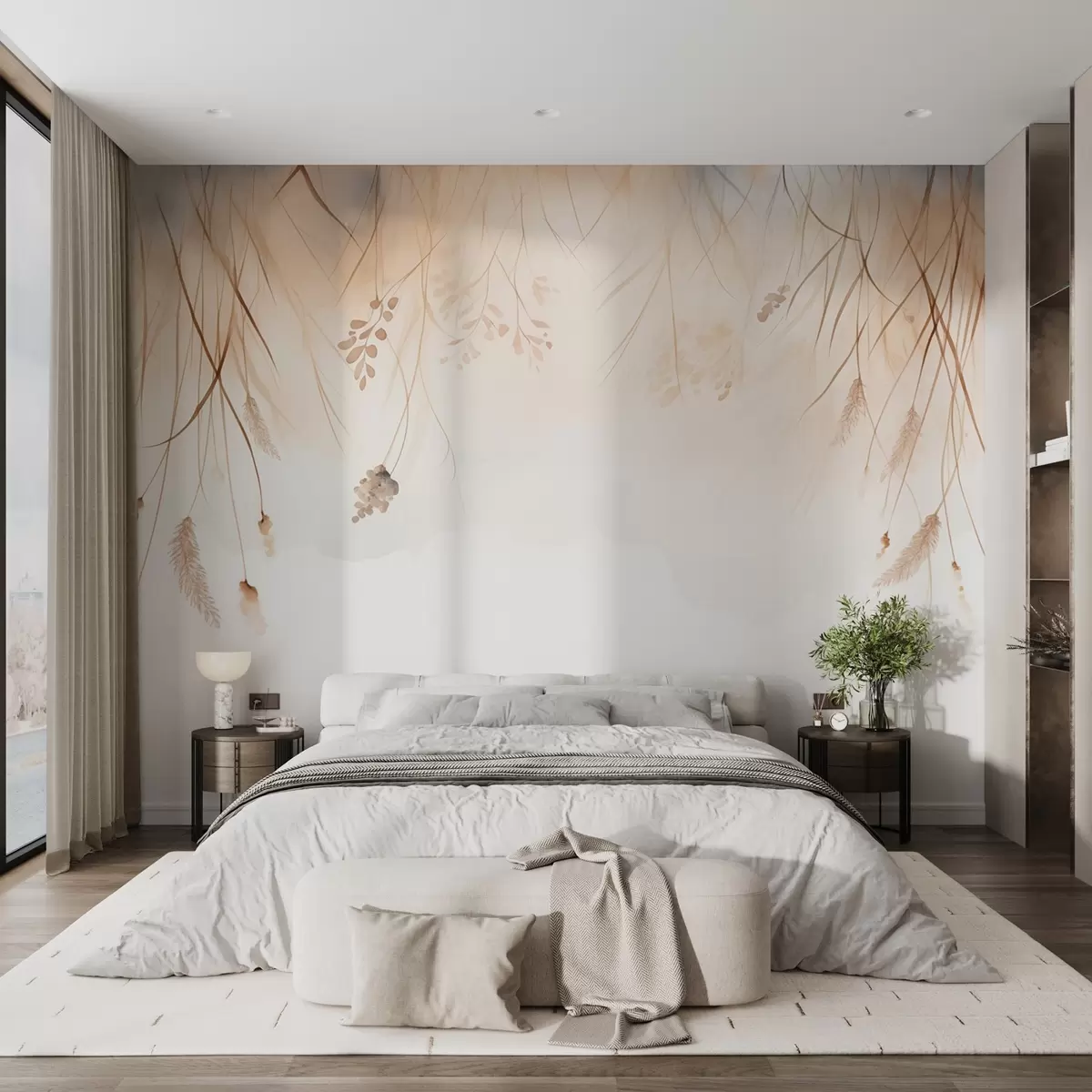 Drooping cattails and grain ears in mist in soft beige and brown shades - Wall mural (No. w09328)