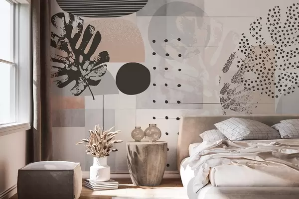 Abstract print with geometric shapes and monstera tropical leaves, circles, dots and lines, modern and minimalist design - Wall mural (No. w09333)