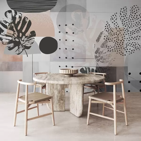 Abstract print with geometric shapes and monstera tropical leaves, circles, dots and lines, modern and minimalist design - Wall mural (No. w09333)