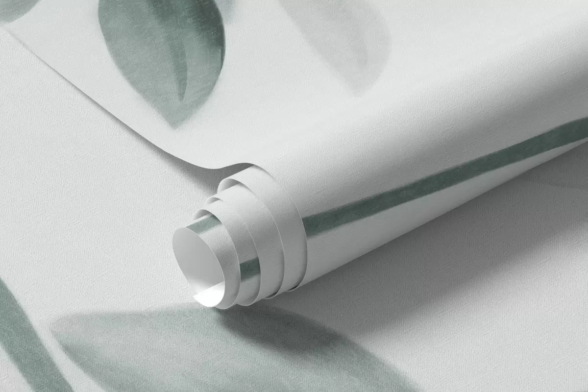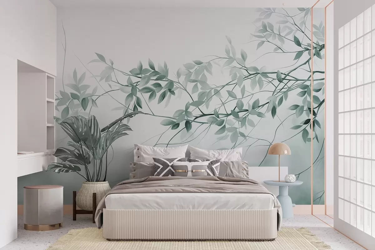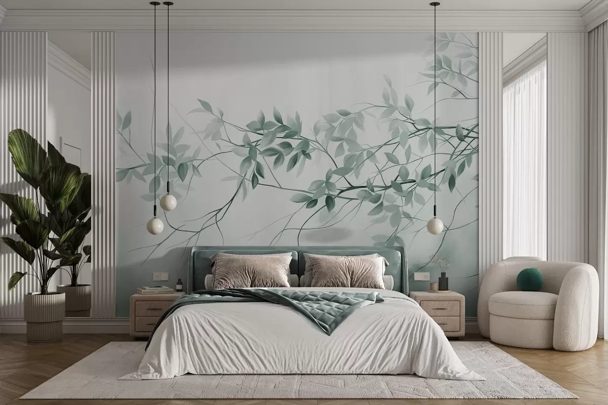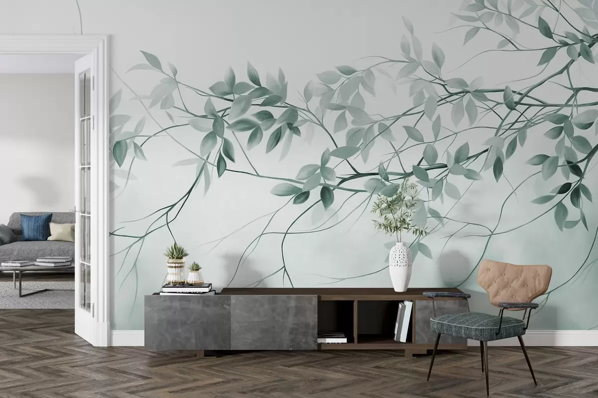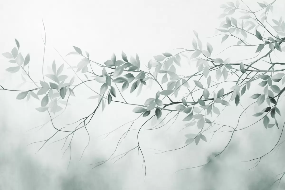Delicate textured branches with muted grey and green leaves against a soft, blurred background - Wall mural (No. w09336v1)