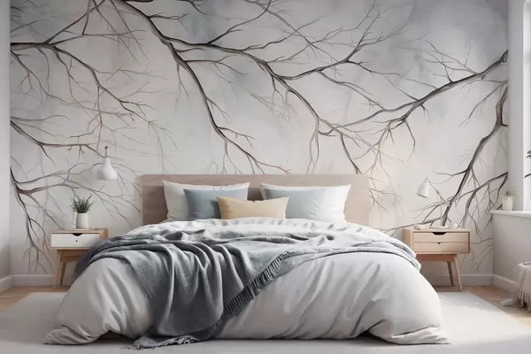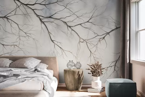 Tree branches with a watercolor textured effect , intricate details, soft color palette, against a light background - Wall mural (No. w09337)