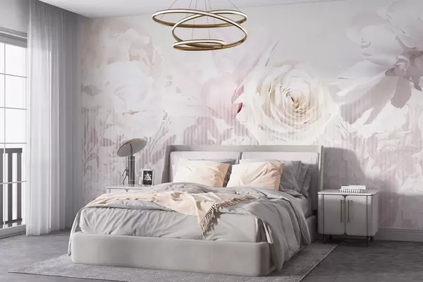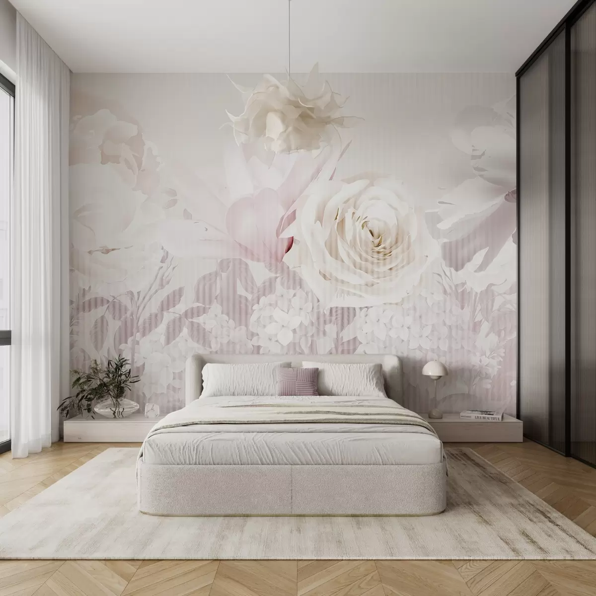 Floral arrangement featuring roses, hydrangeas , and tulips in soft pastel shades of white, pink and beige, with striped texture - Wall mural (No. w09340)
