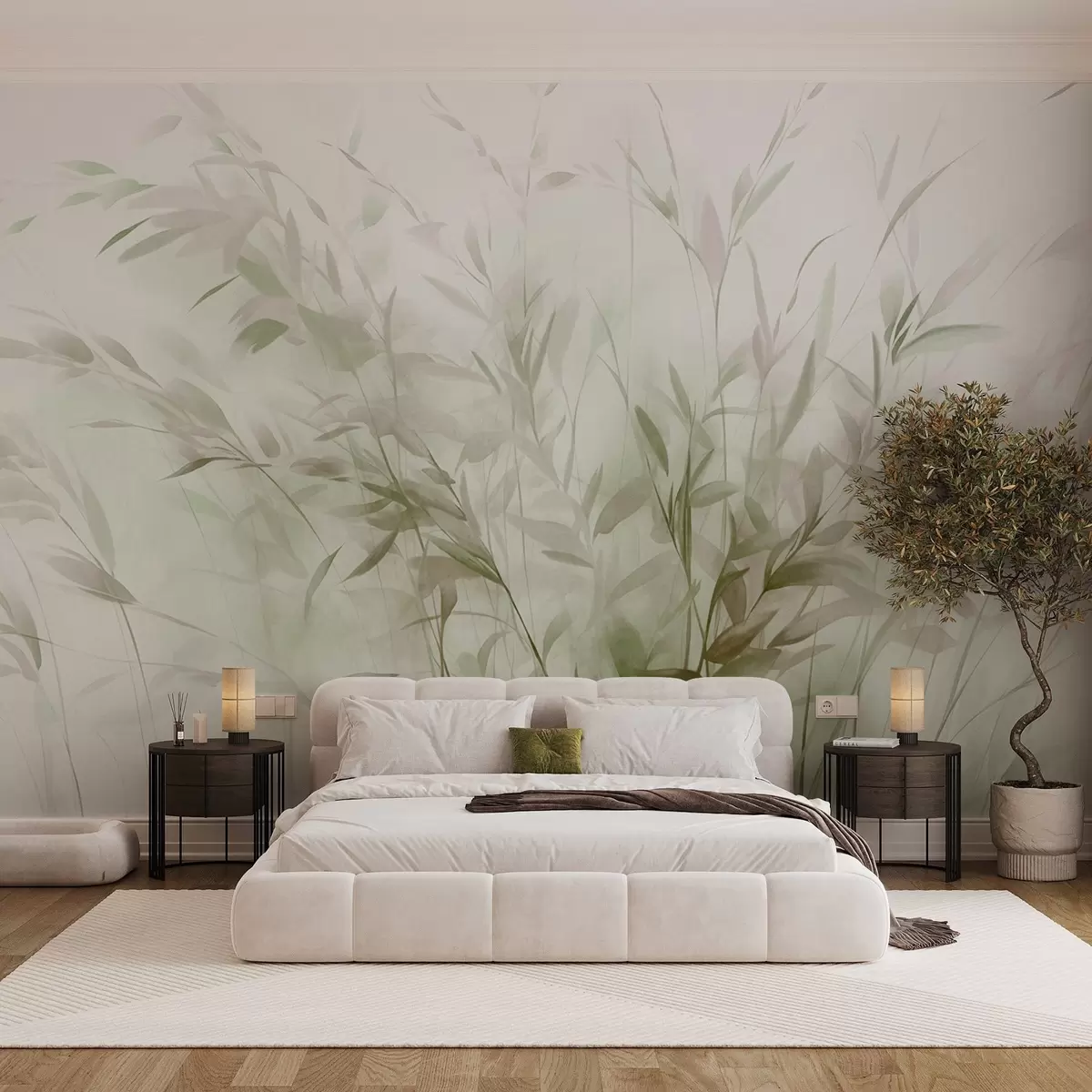 Grass and weeds with thin leaves and stems, light green and brown colors, soft and delicate brushstrokes, minimalist print - Wall mural (No. w09342)