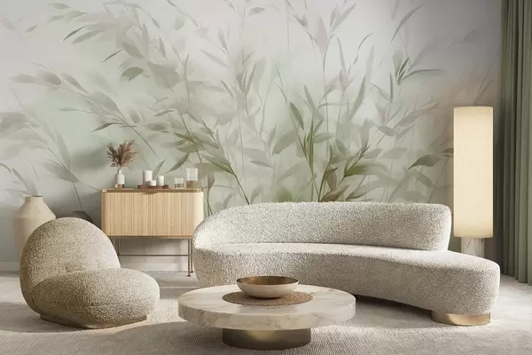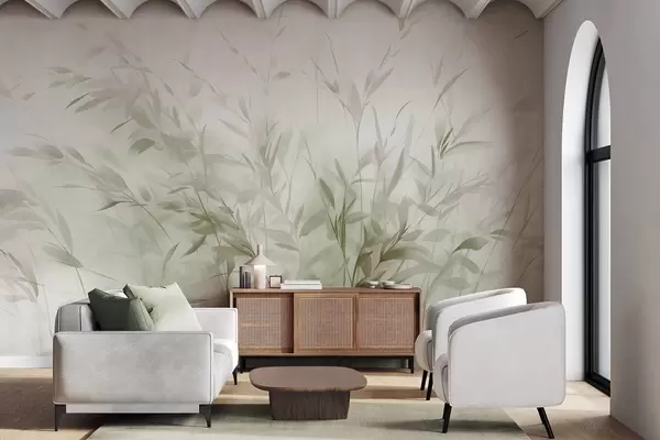 Grass and weeds with thin leaves and stems, light green and brown colors, soft and delicate brushstrokes, minimalist print - Wall mural (No. w09342)