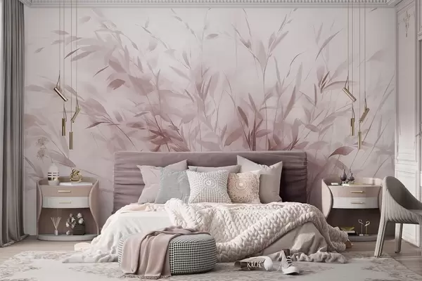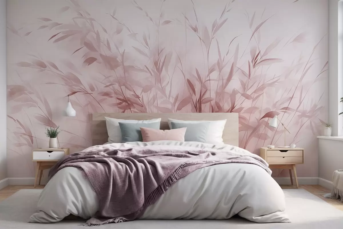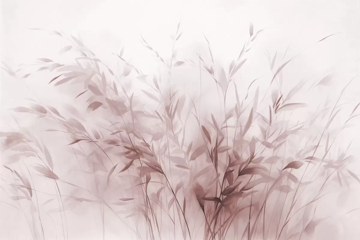 Grass and weeds with thin leaves and stems, light pink colors, soft and delicate brushstrokes, minimalist print - Wall mural (No. w09342v2)