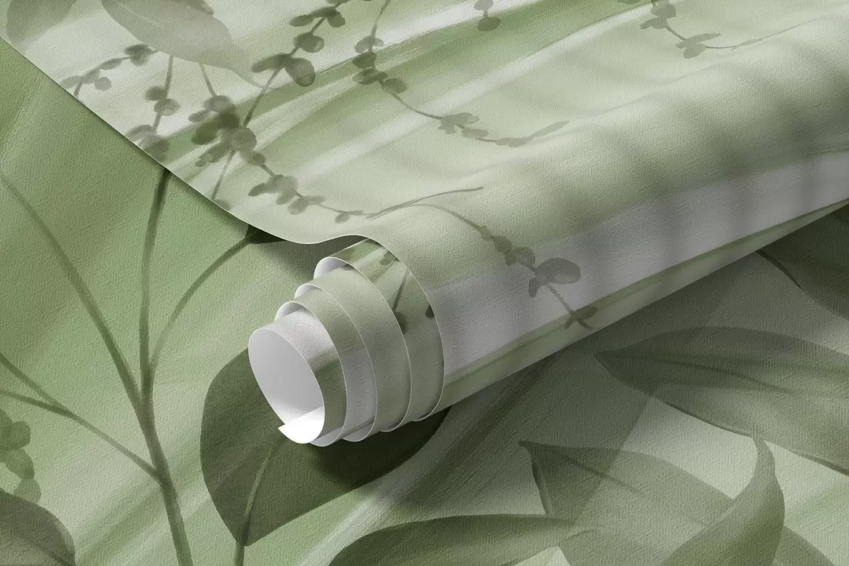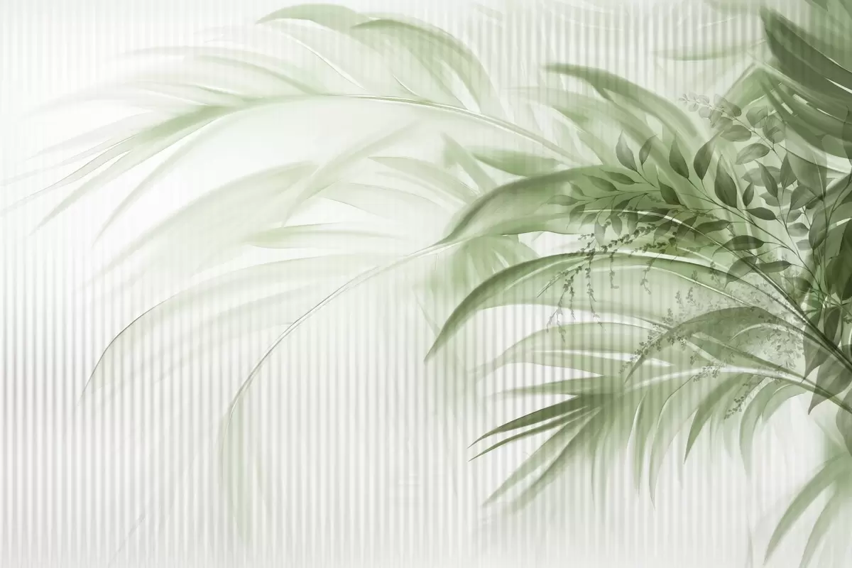 Palm tropical green leaves with a white striped background, soft lighting, delicate brushstrokes, organic forms - Wall mural (No. w09343)