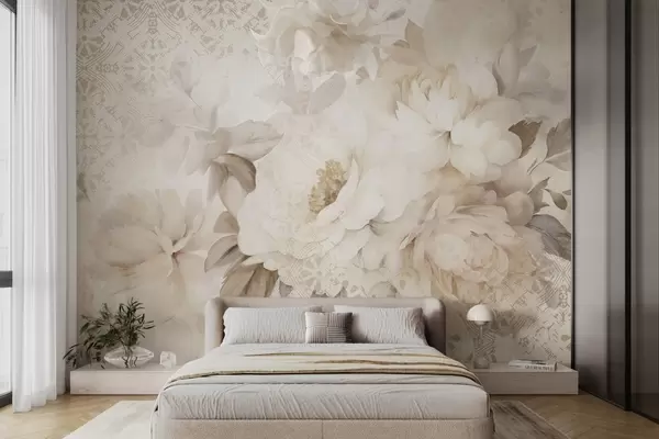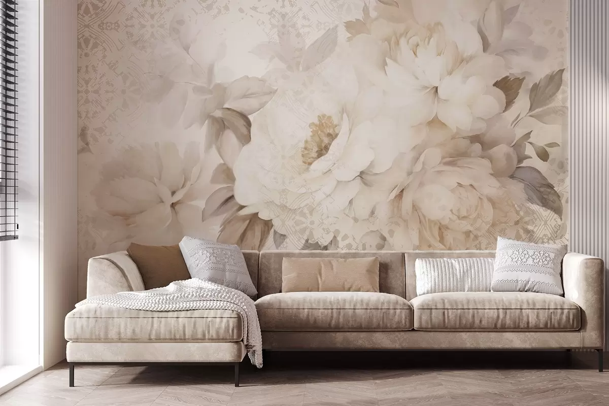 A floral arrangement of white peonies with beige leaves, set against a decorative background with a vintage texture - Wall mural (No. w09345)