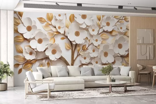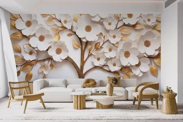 Tree with white flowers and imitation of relief leaves - Wall mural (No. w09348)