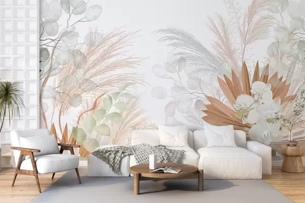 Pampas grass, eucalyptus, tropical leaves and orchids in a white background, pastel colors - Wall mural (No. w09366)