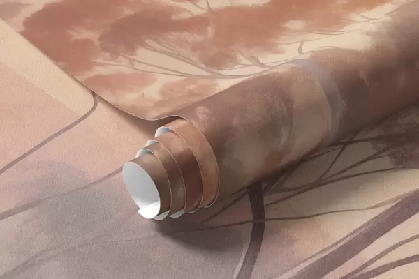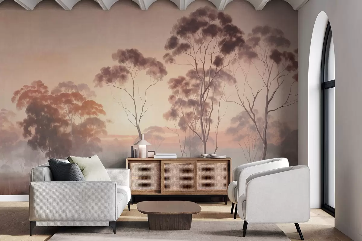 A landscape with eucalyptus trees in a field with pastel pink and orange sky, a light mist, painting textured style - Wall mural (No. w09367)