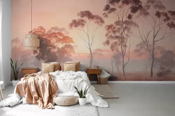 A landscape with eucalyptus trees in a field with pastel pink and orange sky, a light mist, painting textured style - Wall mural (No. w09367)