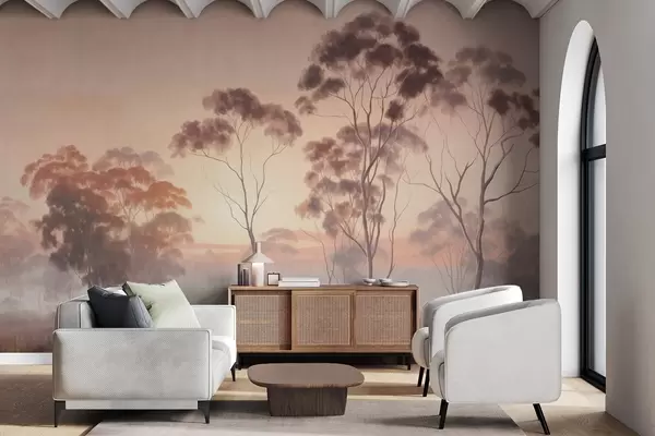 A landscape with eucalyptus trees in a field with pastel pink and orange sky, a light mist, painting textured style - Wall mural (No. w09367)