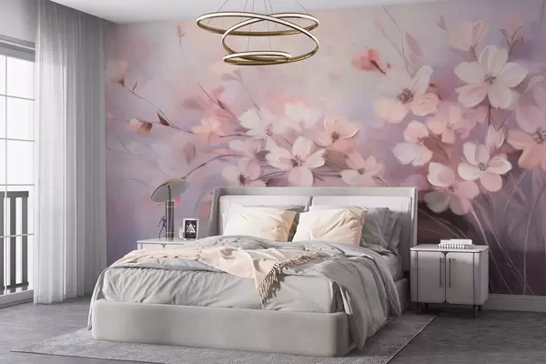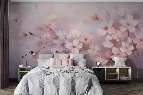 A floral arrangement with delicate flowers with soft, blurred edges, against a pastel background of lavender and light pink hues - Wall mural (No. w09369)