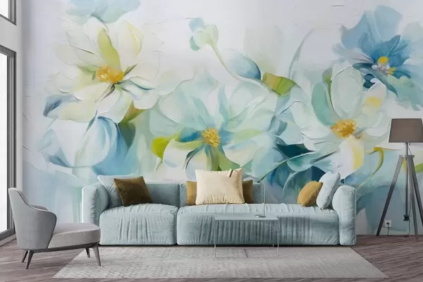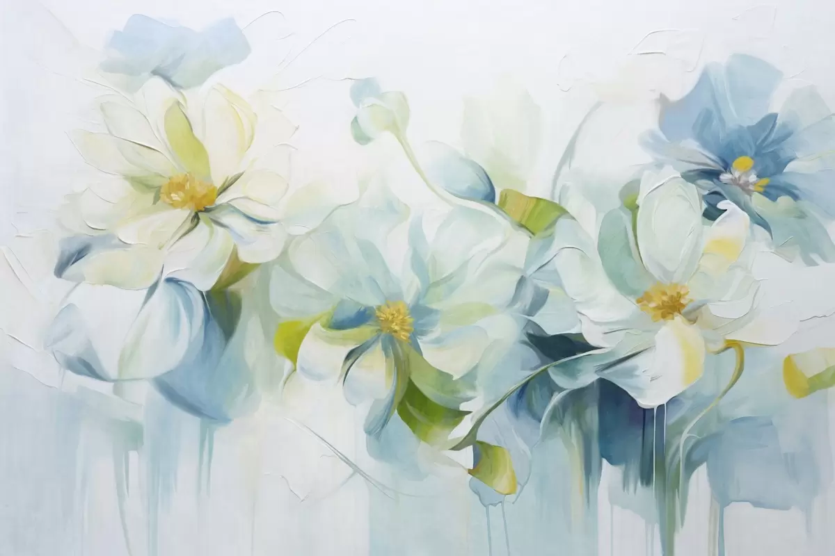 Abstract white and blue flowers with yellow pistils and green leaves, in a white background, textured painting style - Wall mural (No. w09372)