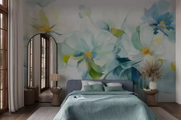 wall murals Abstract white and blue flowers with yellow pistils and green leaves, in a white background, textured painting style w09372