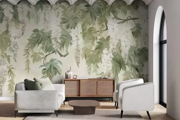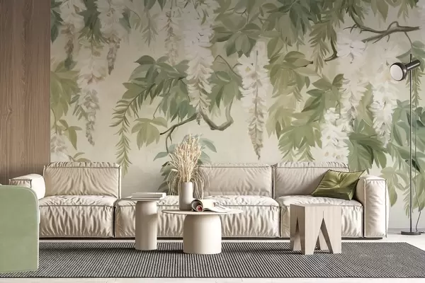 Wisteria branches with white flowers and green leaves, green background, textured vintage painting style - Wall mural (No. w09375)