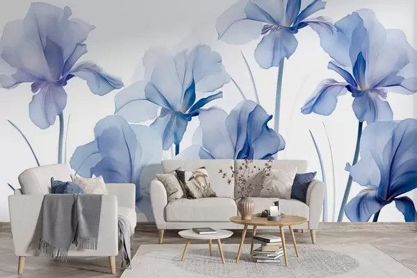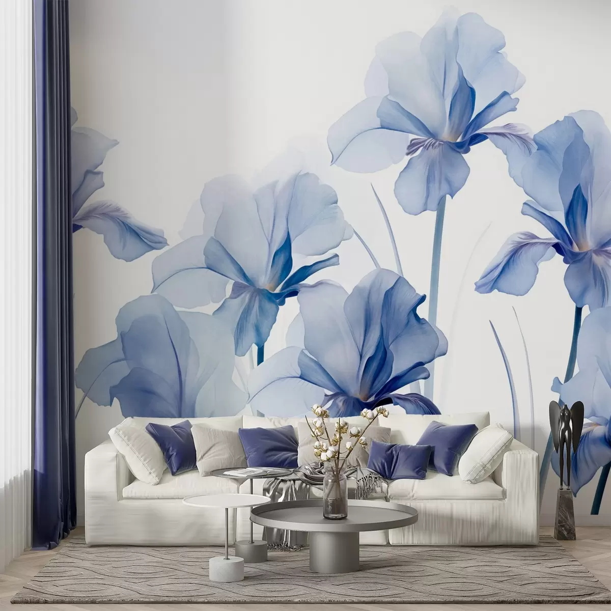 Blue iris flowers with translucent petals and long stems, arranged in a row against a blue background, soft and textured - Wall mural (No. w09379)