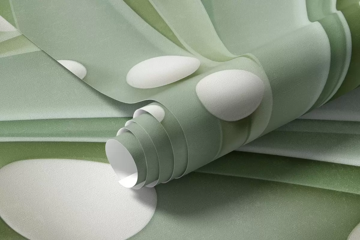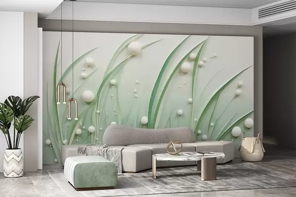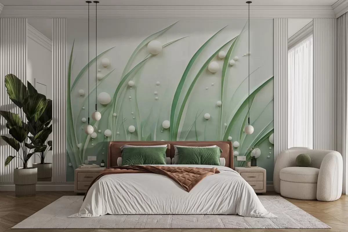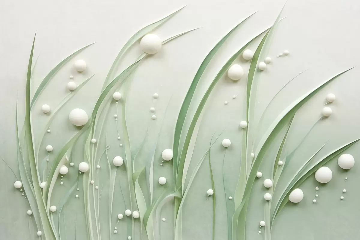 Abstract green grass with white spheres, light green background, textured, clean lines, minimalist style - Wall mural (No. w09382)