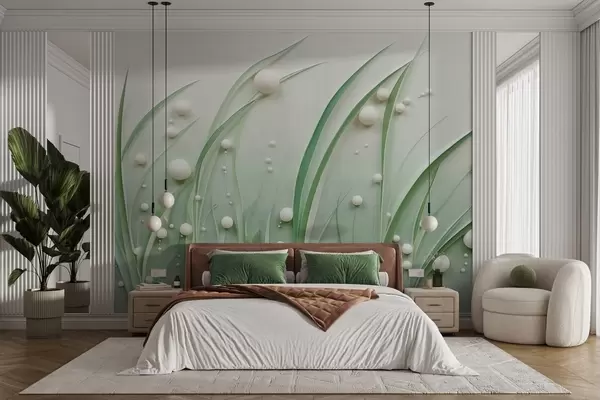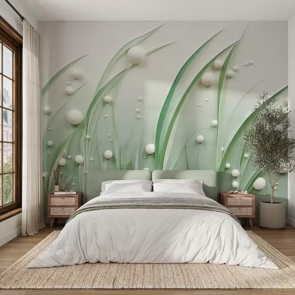 wall murals Abstract green grass with white spheres, light green background, textured, clean lines, minimalist style w09382