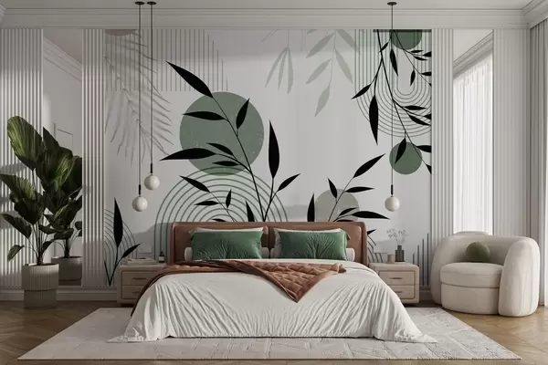 Textured abstract print with geometric shapes, circles and arches and black and green plants on a white background - Wall mural (No. w09384)