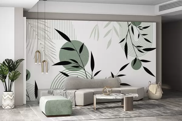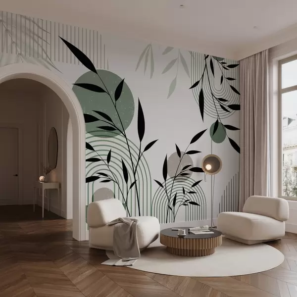 Textured abstract print with geometric shapes, circles and arches and black and green plants on a white background - Wall mural (No. w09384)