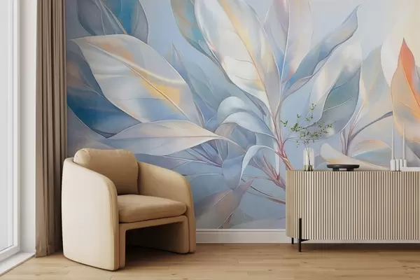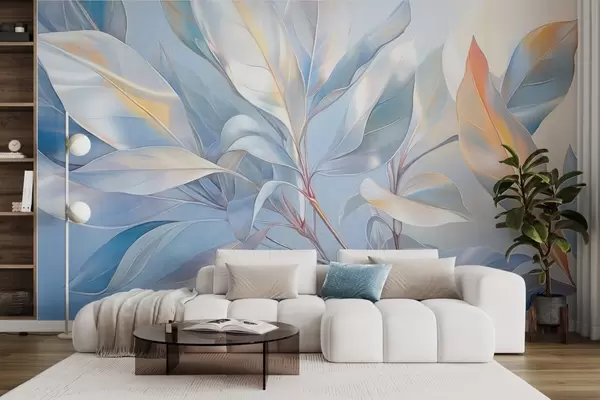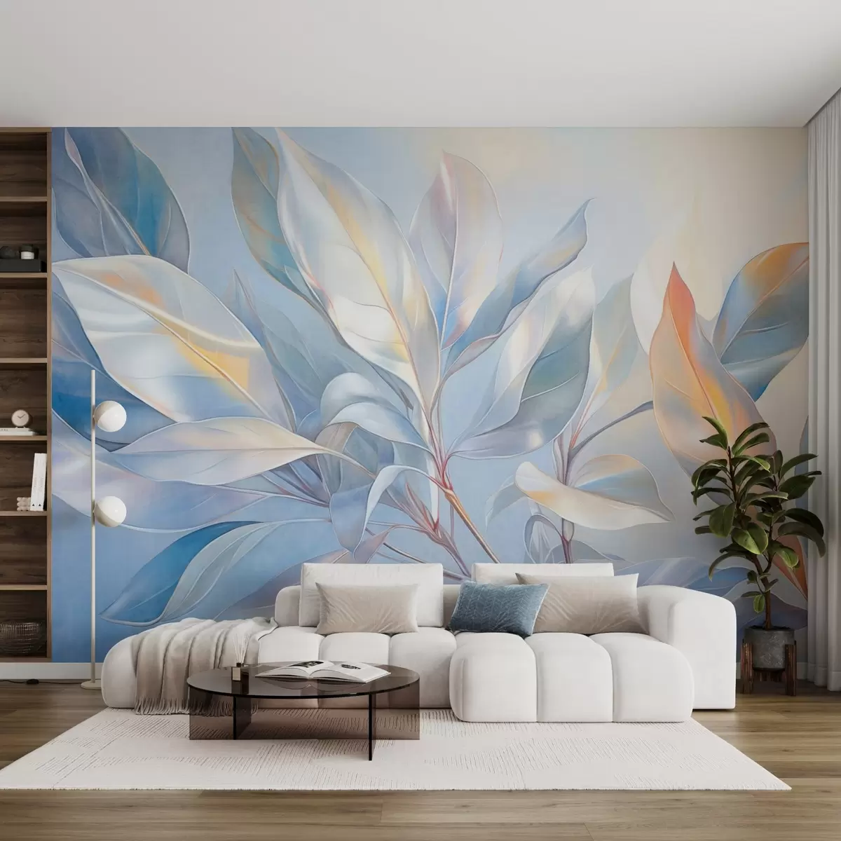 Magnolia leaves with white and blue tones, soft lighting, elegant composition, detailed leaf veins, artistic brushstrokes - Wall mural (No. w09385)