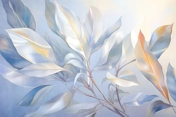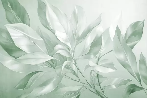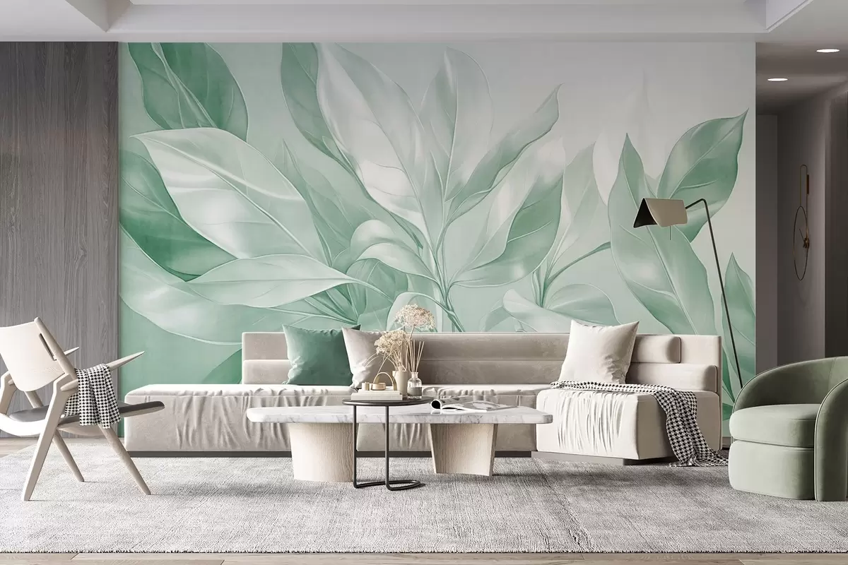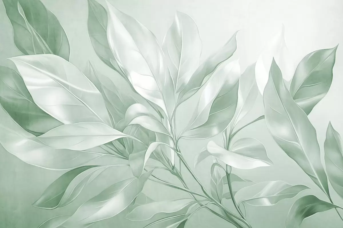 Magnolia leaves with white and green tones, soft lighting, elegant composition, detailed leaf veins, artistic brushstrokes - Wall mural (No. w09385v1)