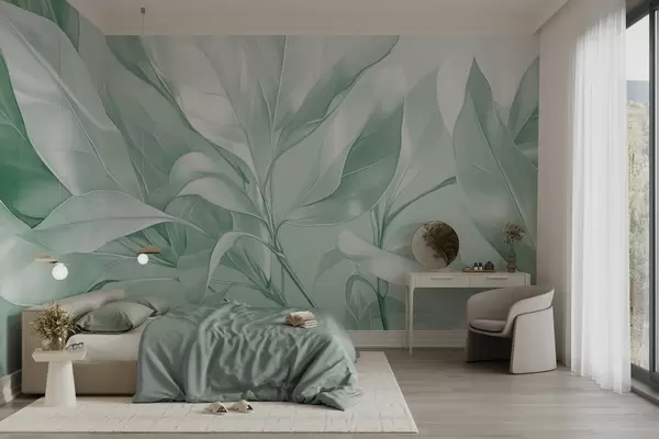 Magnolia leaves with white and green tones, soft lighting, elegant composition, detailed leaf veins, artistic brushstrokes - Wall mural (No. w09385v1)