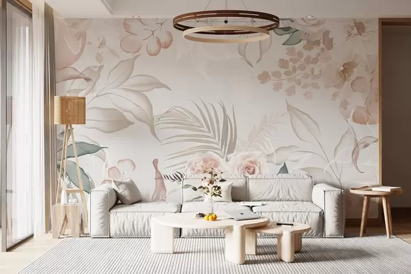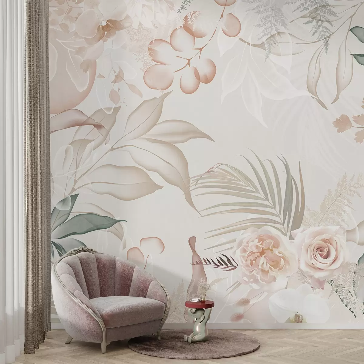 Floral textured arrangement with roses, orchids, eucalyptus and palm leaves in pastel colors, beige background - Wall mural (No. w09393)