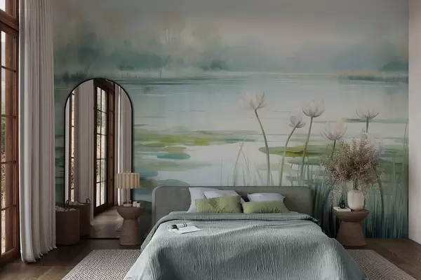 Landscape with a lake, water lilies and lily pads, trees in the background, in a calm environment, light blue and green tones - Wall mural (No. w09395)