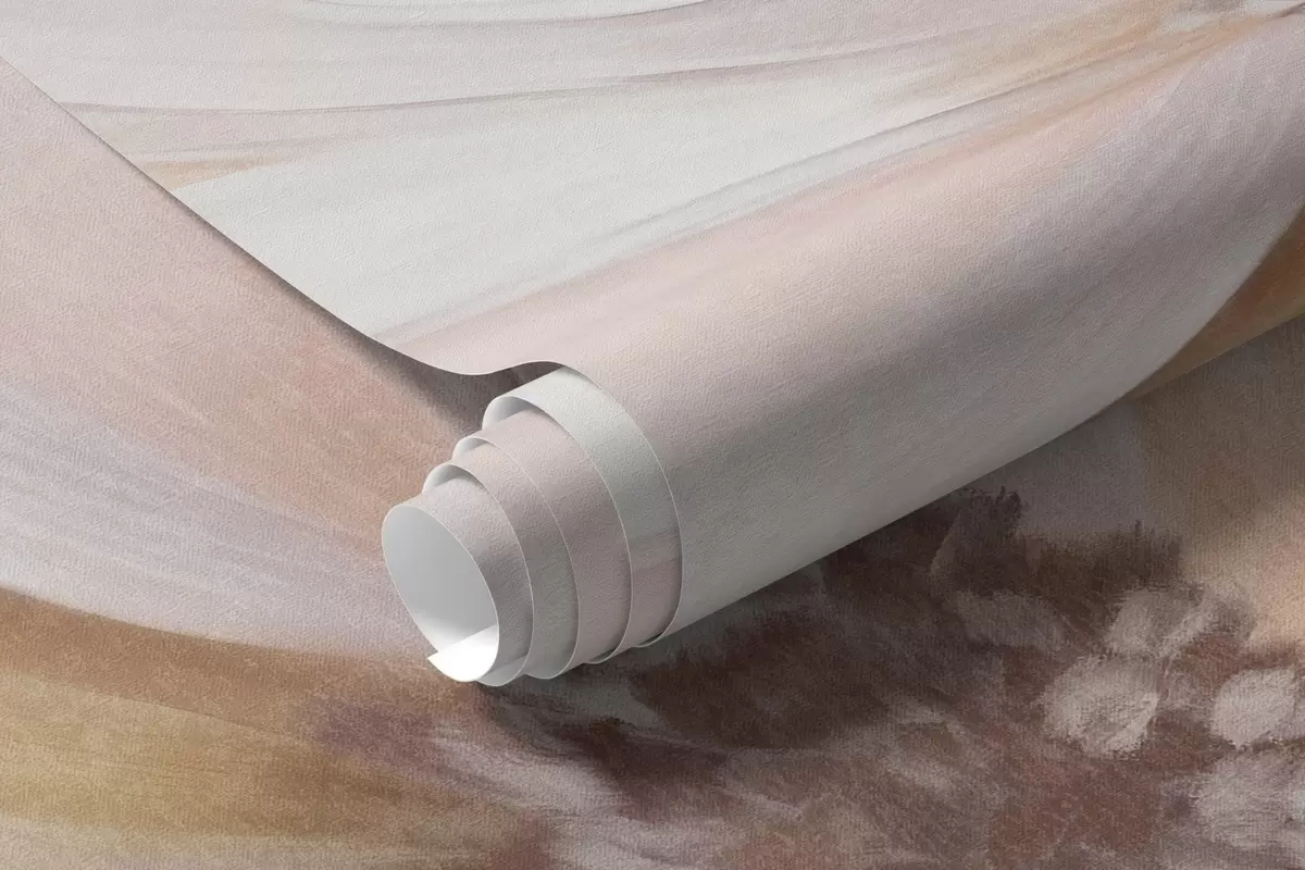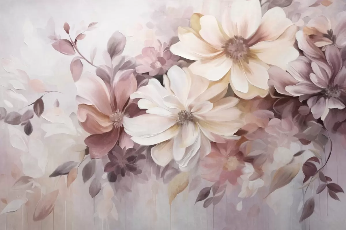 A floral arrangement with large textured soft-colored flowers in shades of burgundy, peach, and white, with delicate leaves - Wall mural (No. w09398)