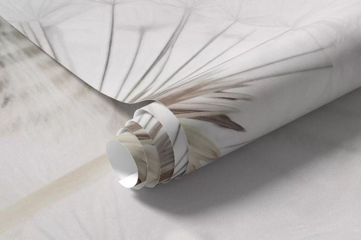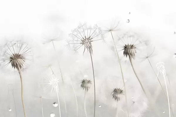 Dandelions with water drops, white background, close up, soft light, nature, botanical, ethereal, delicate, minimalist - Wall mural (No. w09399)