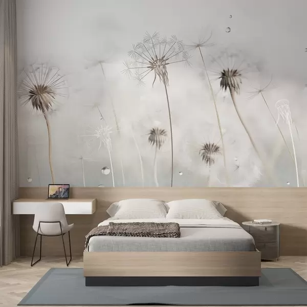 Dandelions with water drops, white background, close up, soft light, nature, botanical, ethereal, delicate, minimalist - Wall mural (No. w09399)