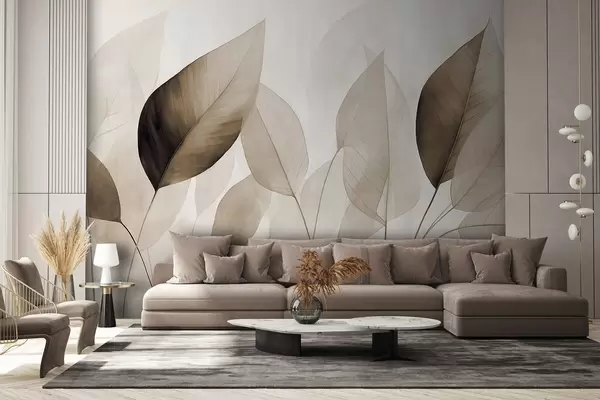 Textured painting imitation of leaves in shades of brown and beige with delicate veins and stems - Wall mural (No. w09400v1)