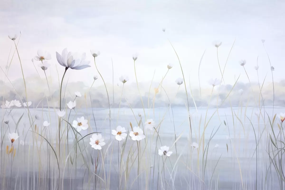 White flowers with long stems in a field, light blue sky, soft colors, textured, minimalist style, nature-inspired, calm background - Wall mural (No. w09401)