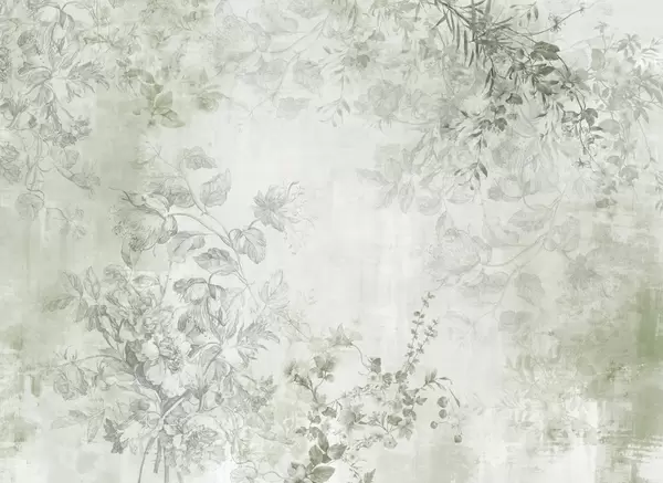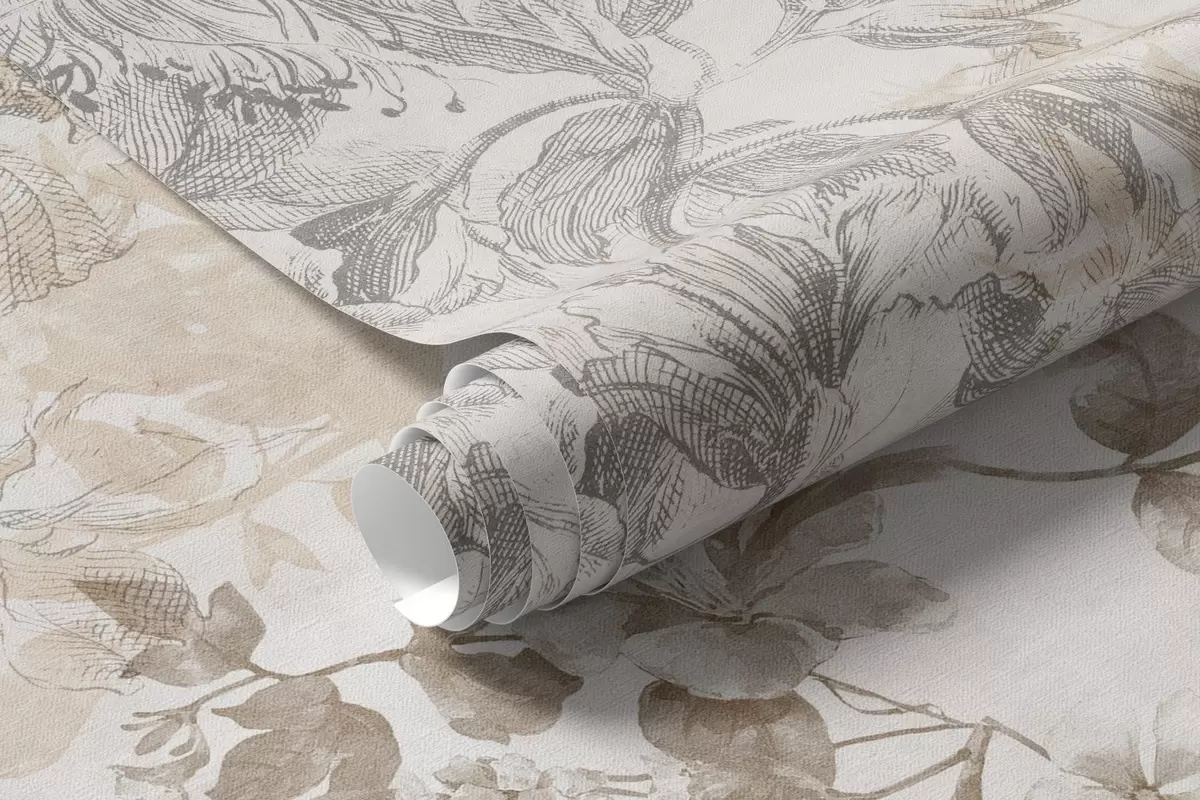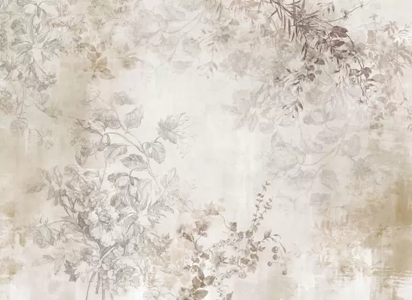 Vintage textured floral art with drawing style delicate garden flowers and leaves illustrations, soft pastel beige and sepia tones - Wall mural (No. w09402)